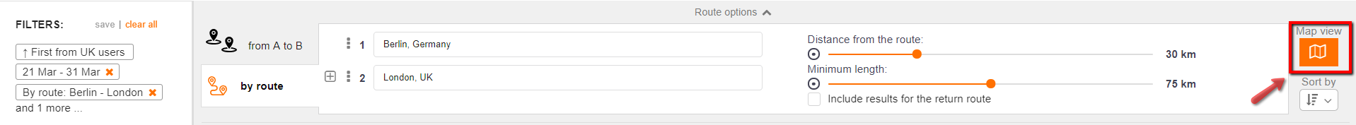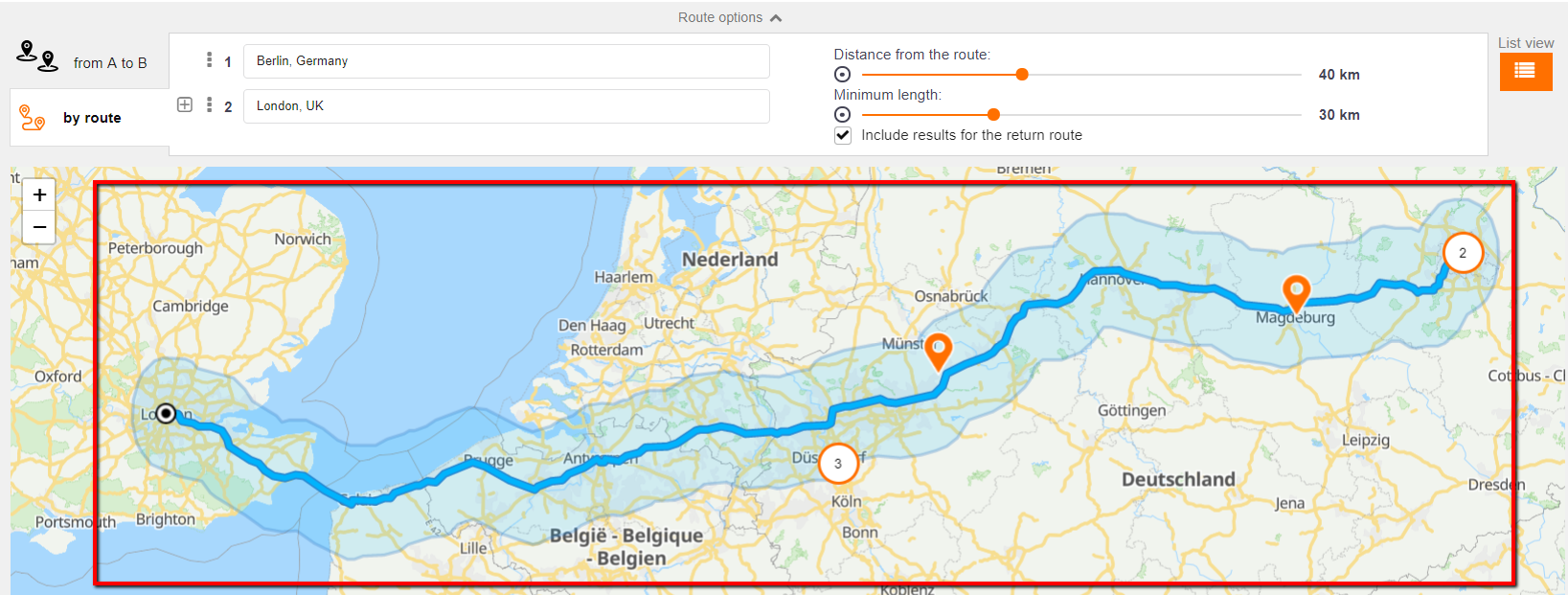 If you’ve already chosen a route, you’ll see it marked on the map. If you are searching by route, you’ll also see the distance from the main route you’ve set for the search (marked in light blue).