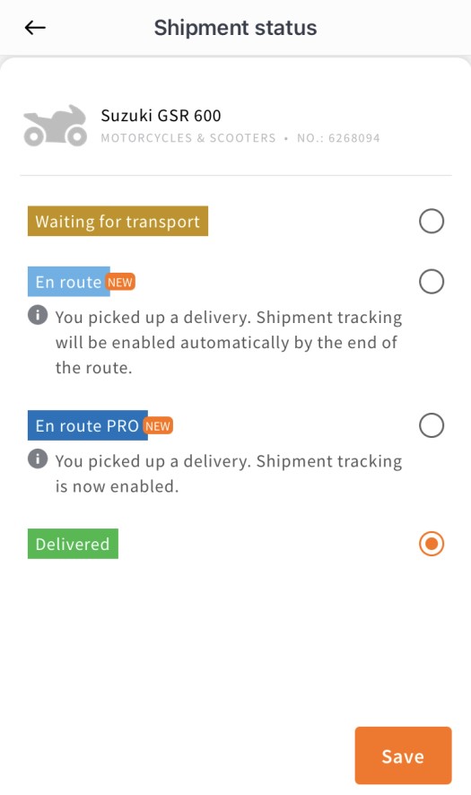 The shipment tracking stops automatically as soon as you change the shipment status to "Delivered". If the shipment has the status “En route” or “En route PRO”, but due to technical issues (such as no Internet connection, switched-off phone etc) you cannot share your location, the customer will see the last location we received from your phone.